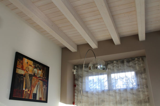 Strutturalmente, per il tetto, sono state utilizzate travi in legno con resina ipossidica e fissate attraverso appositi pioli in ferro. Alle travi sono state intercalate sezioni di legno lamellare combinato per dare continuità visiva alle travi in legno internamente all’edificio.